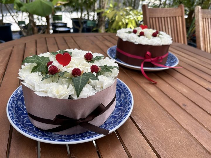 バレンタインケーキをモチーフにした、フラワーアレンジメントを作ります。
